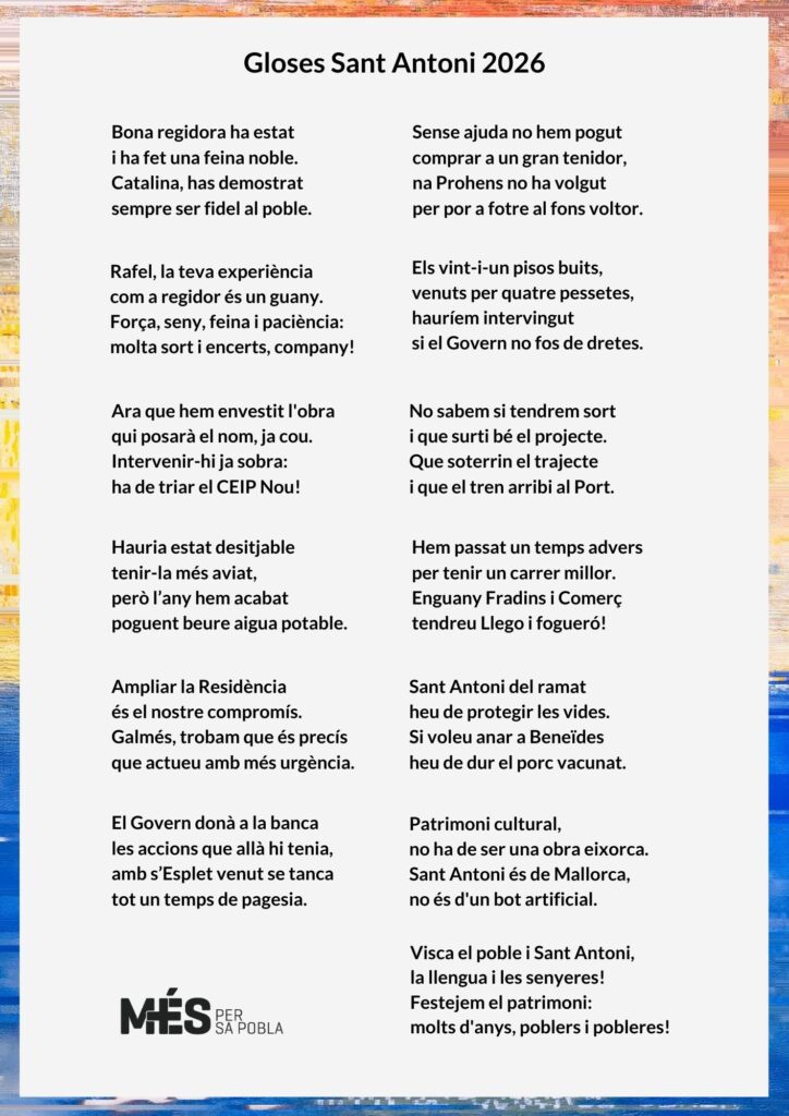 Amb motiu de les festes de Sant Antoni 2026, MÉS per sa Pobla ha fet públic el tradicional recull de gloses elaborades expressament per a l’ocasió, amb l’objectiu de reivindicar la glosa mallorquina com a expressió viva de la cultura popular i com una eina legítima per tractar l’actualitat del poble, amb ironia, arrelament i esperit crític.